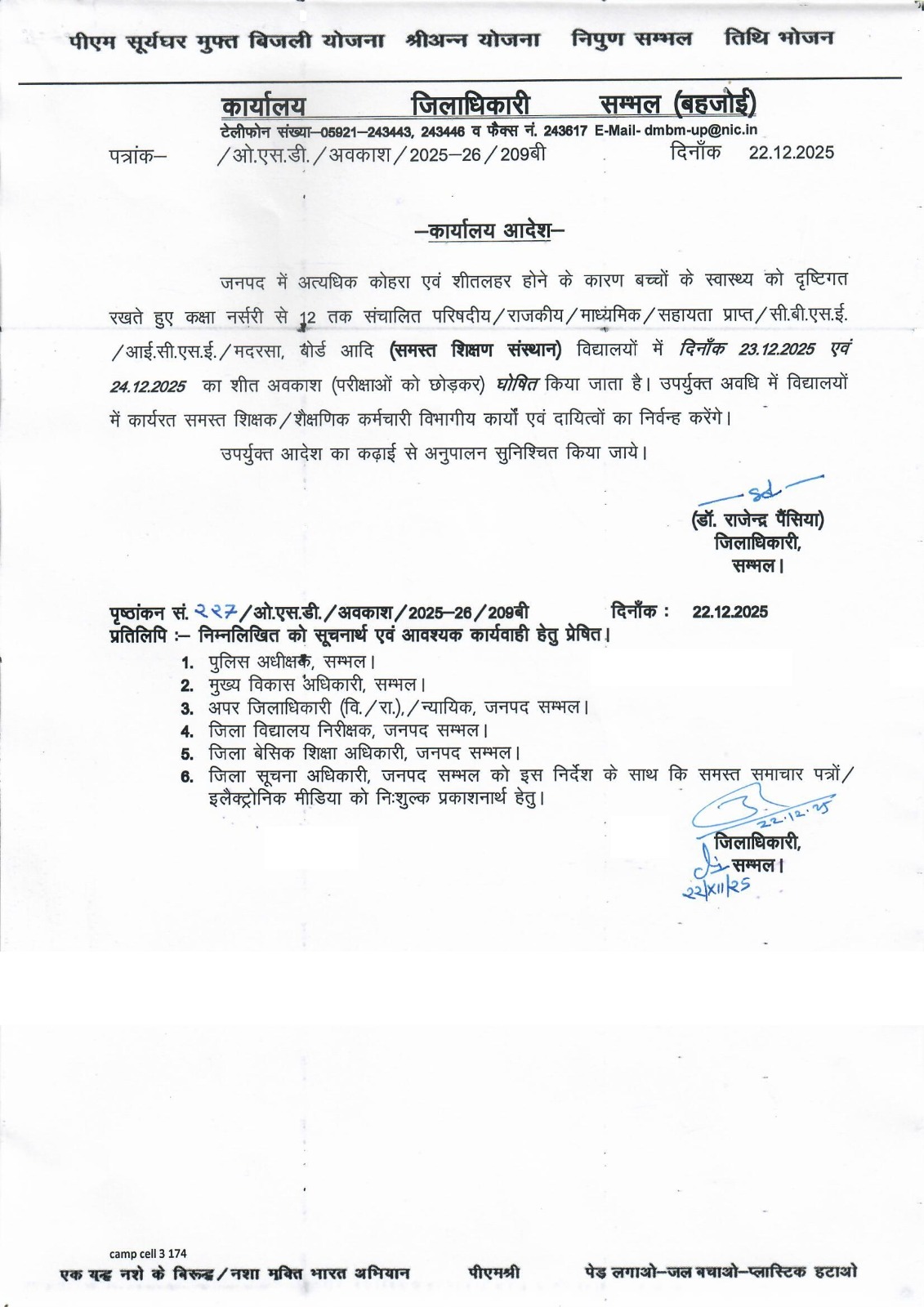 शीतलहर के दृष्टिगत छात्रों के लिए 23 व 24 का अवकाश हुआ घोषित