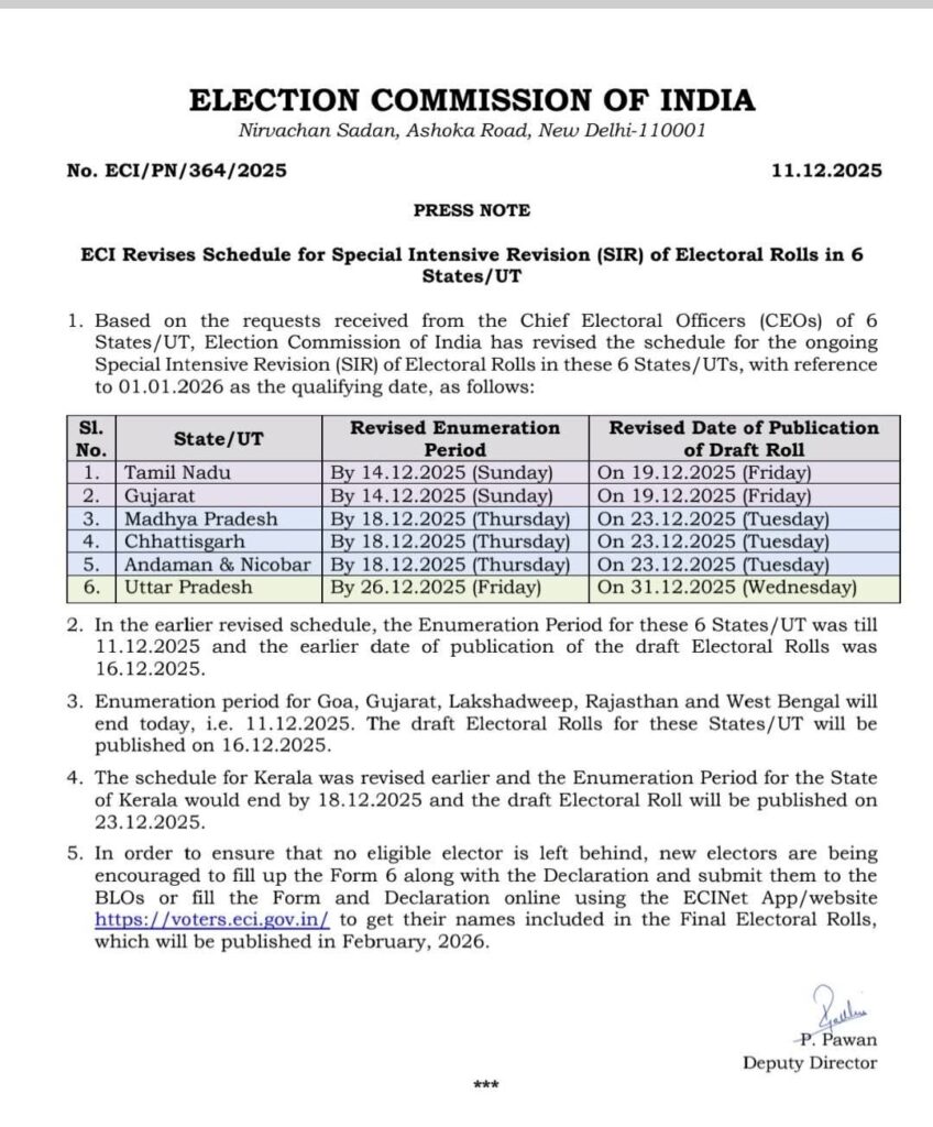 यूपी में विशेष प्रगाढ़ पुनरीक्षण (एसआईआर) के लिए केंद्रीय चुनाव आयोग से और समय मांगा गया है। इसे अब मंजूर कर दिया गया है। यूपी में अब एसआईआर की सीमा 31 दिसंबर तक बढ़ा दी गई है। मुख्य निर्वाचन अधिकारी नवदीप रिणवा ने बताया कि इस संबंध में आयोग को पत्र भेज दिया था। ताकि मृतक, स्थानांतरित और अनुपस्थित मतदाताओं का पुन: सत्यापन कराया जा सके।