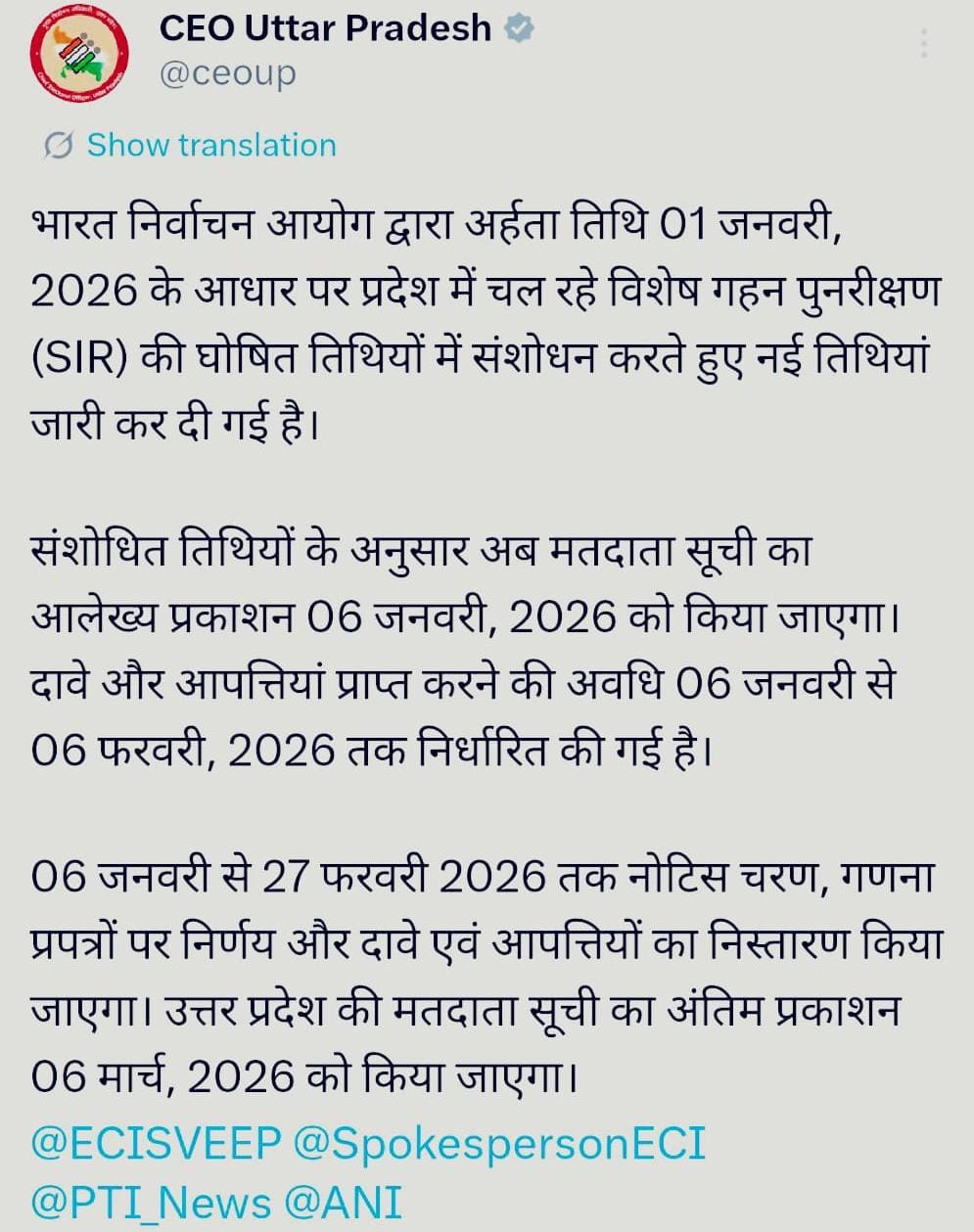 उत्तर प्रदेश के मुख्य निर्वाचन अधिकारी श्री नवदीप रिणवा ने बताया कि भारत निर्वाचन आयोग द्वारा अर्हता तिथि 1 जनवरी, 2026 के आधार पर प्रदेश में चल रहे विशेष गहन पुनरीक्षण (SIR) की घोषित तिथियों में संशोधन करते हुए नई तिथियां जारी कर दी गई है।