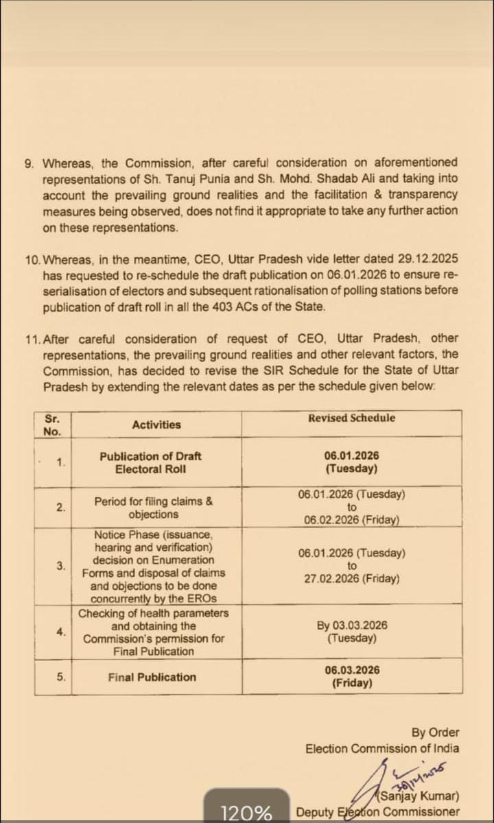 06 जनवरी से 27 फरवरी 2026 तक नोटिस चरण, गणना प्रपत्रों पर निर्णय और दावे एवं आपत्तियों का निस्तारण किया जाएगा। उत्तर प्रदेश की मतदाता सूची का अंतिम प्रकाशन 06 मार्च, 2026 को किया जाएगा।