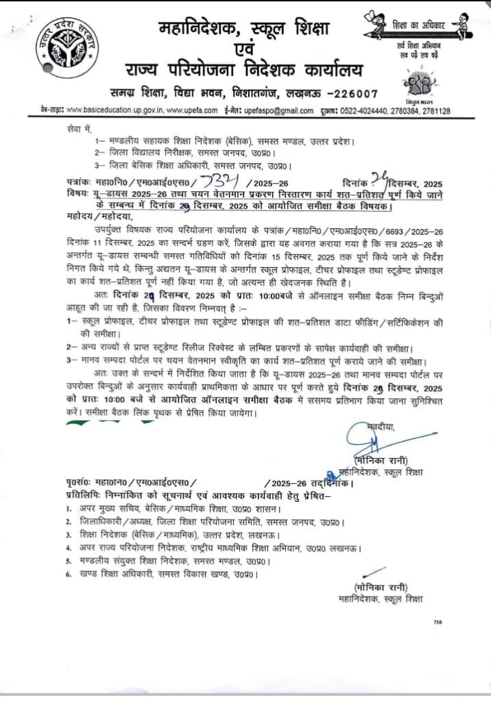 Home PRIMARY KA MASTER यू-डायस 2025-26 तथा चयन वेतनमान प्रकरण निस्तारण कार्य शत-प्रतिशत पूर्ण किए जाने के संबंध में में 29 दिसम्बर 2025 को सुबह 10 बजे से ऑनलाइन समीक्षा बैठक होगी