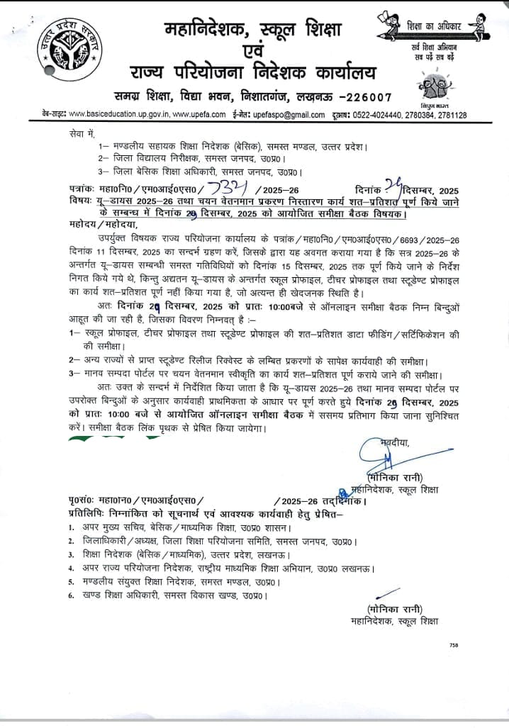 यू-डायस 2025-26 तथा चयन वेतनमान प्रकरण निस्तारण कार्य शत-प्रतिशत पूर्ण किए जाने के संबंध में में 29 दिसम्बर 2025 को सुबह 10 बजे से ऑनलाइन समीक्षा बैठक होगी