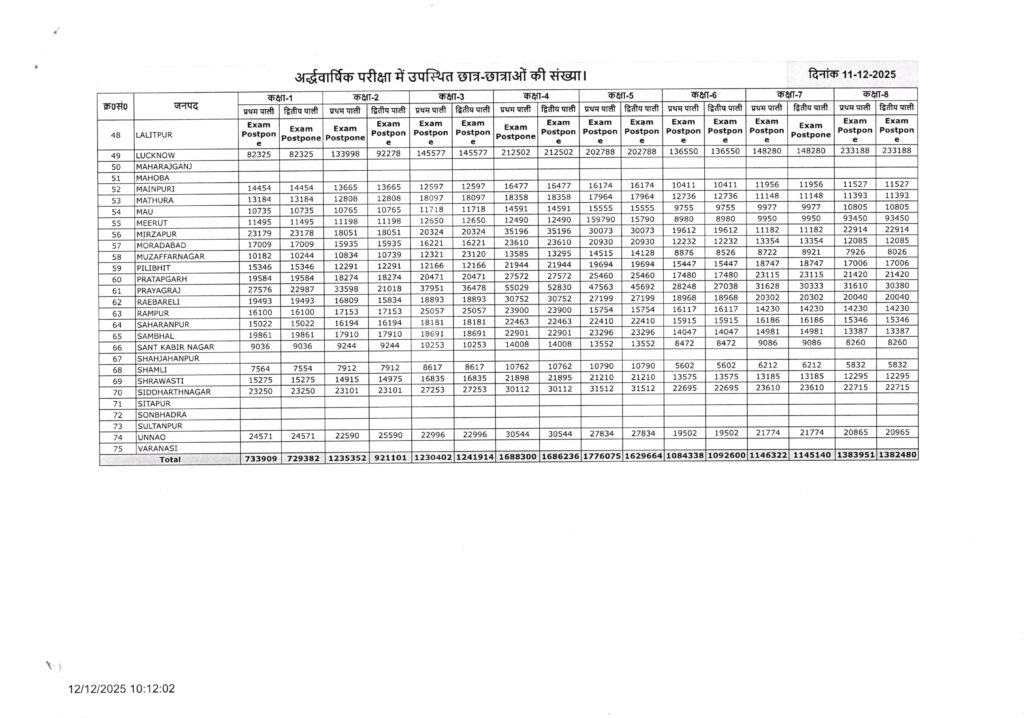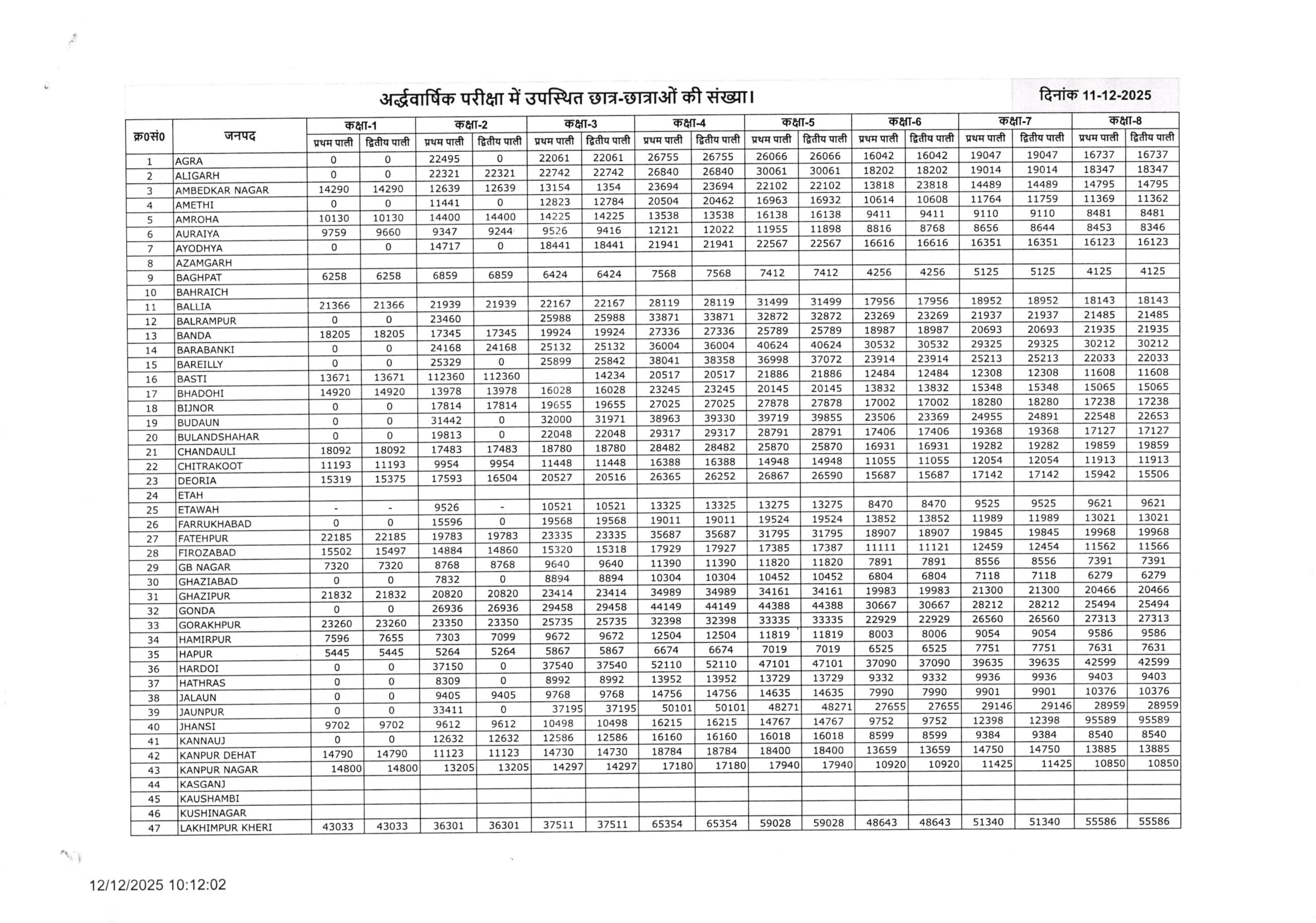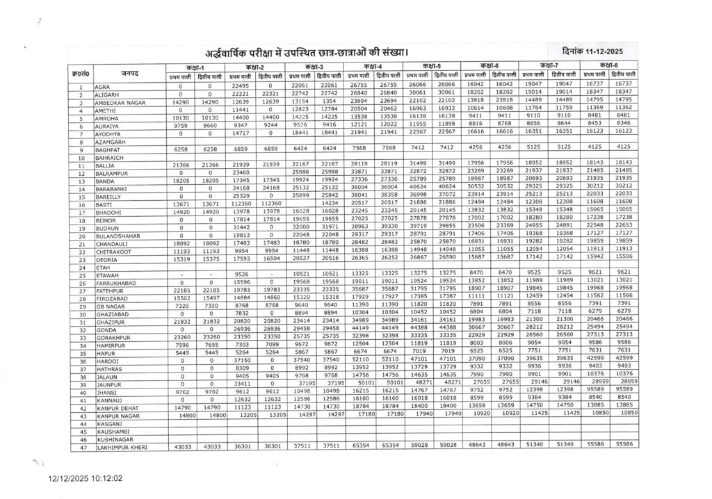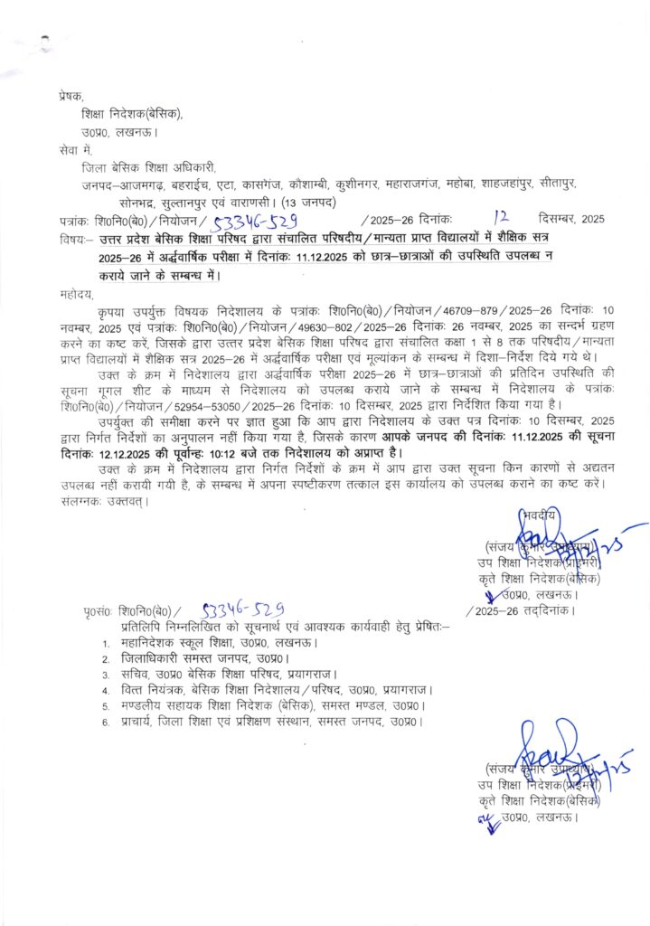 उत्तर प्रदेश बेसिक शिक्षा परिषद द्वारा संचालित परिषदीय / मान्यता प्राप्त विद्यालयों में शैक्षिक सत्र 2025-26 में अर्द्धवार्षिक परीक्षा में दिनांकः 11.12.2025 को छात्र-छात्राओं की उपस्थिति उपलब्ध न कराये जाने के सम्बन्ध में।