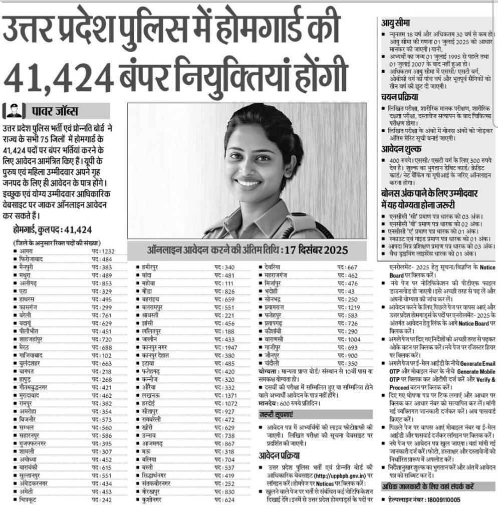 उत्तर प्रदेश पुलिस में होमगार्ड की 41,424 बंपर नियुक्तियां होंगी