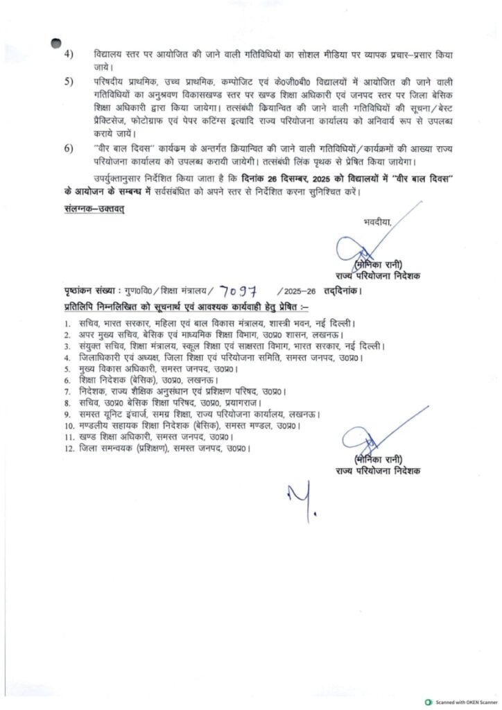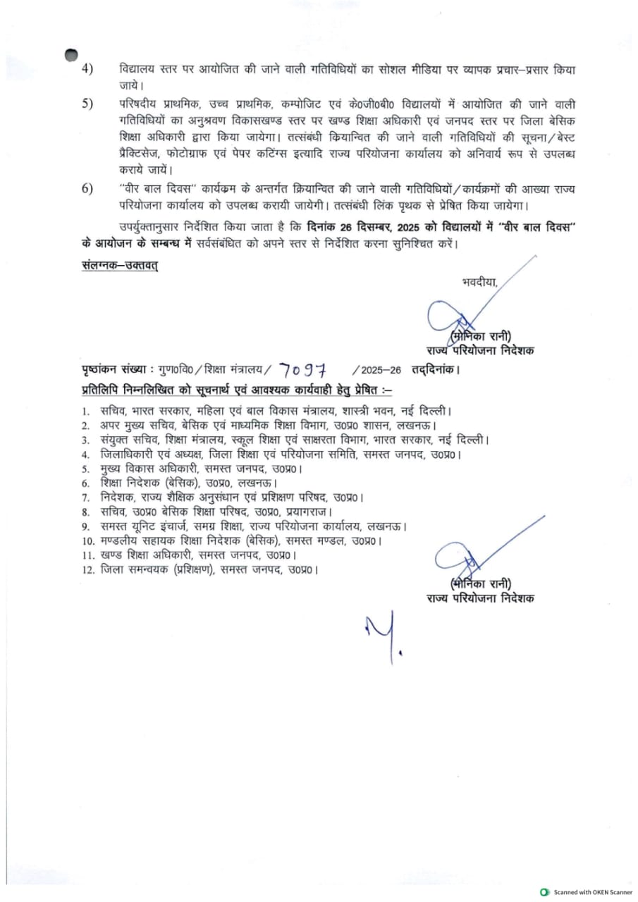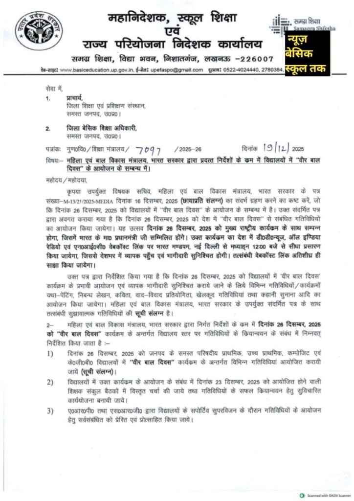 महिला एवं बाल विकास मंत्रालय, भारत सरकार द्वारा प्रदत्त निर्देशों के क्रम में दिनांक 26 दिसंबर ,2025 को समस्त विद्यालयों में वीर बाल दिवस कार्यक्रम का आयोजन किये जाने के संबंध में👆