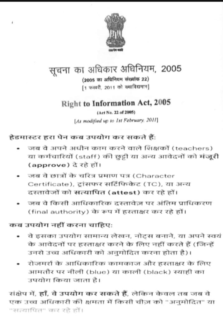 हेडमास्टर हरे पेन का उपयोग कहाँ कहाँ कहां कर सकता है? देखिए सूचना का अधिकार अधिनियम 2005 के अंतर्गत नियम