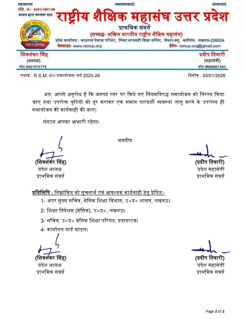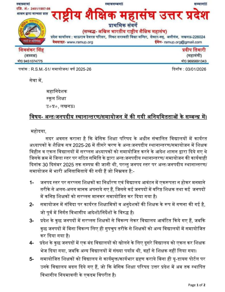 राष्ट्रीय शैक्षिक महासंघ के प्राथमिक संवर्ग ने परिषदीय विद्यालयों में शिक्षकों के तीसरे चरण के समायोजन में अनियमितता के आरोप लगाए हैं। साथ ही इन समायोजन को निरस्त करने की मांग की है। प्रदेश अध्यक्ष शिवशंकर सिंह ने बताया कि बेसिक के विद्यालयों में शिक्षकों के शैक्षिक सत्र 2025-26 में तीसरे चरण के समायोजन में शिक्षकविहीन व एकल विद्यालयों में सरप्लस को समायोजित करने का आदेश शासन ने दिया था। इस क्रम में जिला स्तर पर गठित समिति द्वारा समायोजन की कार्यवाही 30 दिसंबर तक की जानी थी। किंतु जिला स्तर पर समायोजन में काफी गड़बड़ी की गयी हैं।