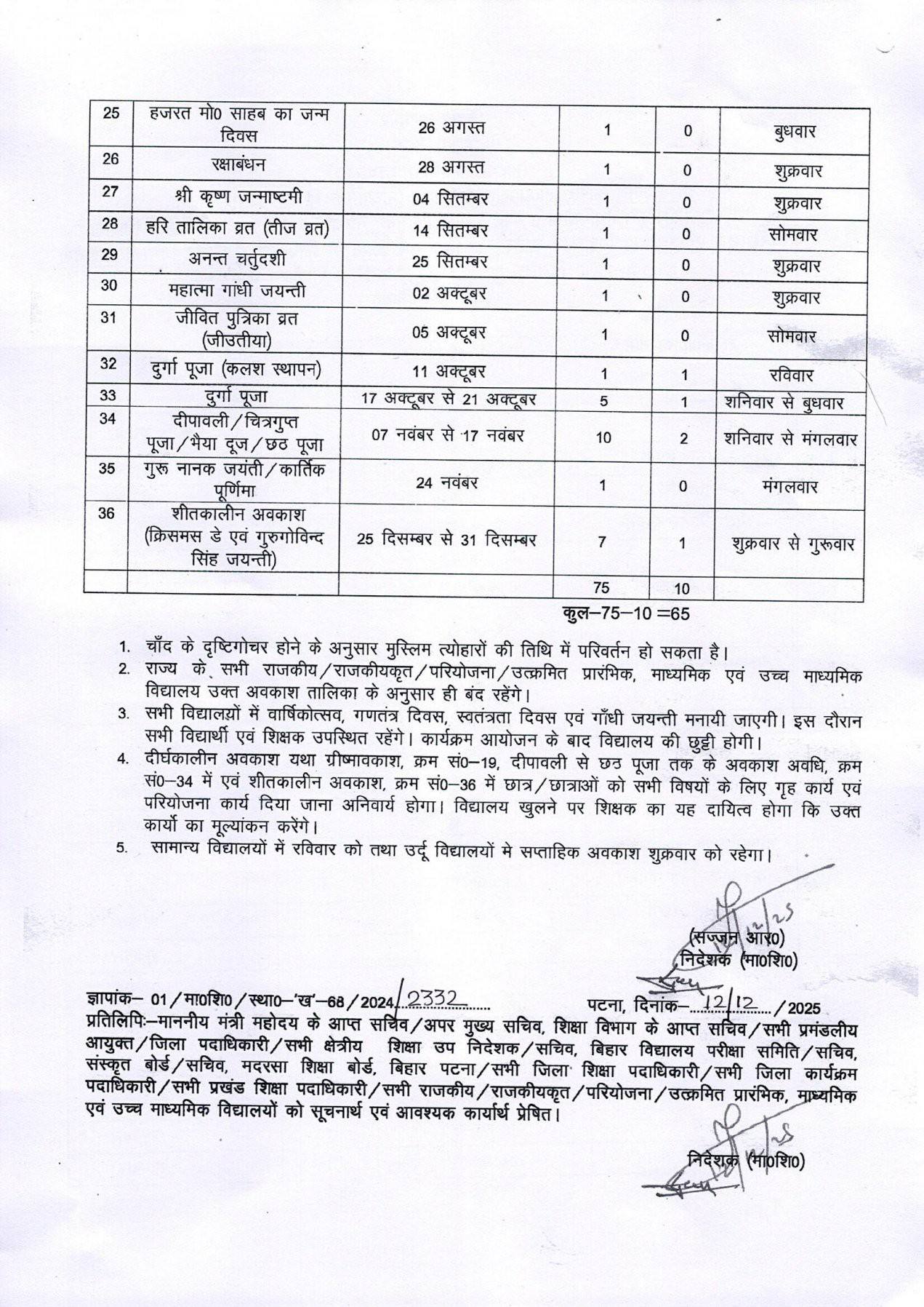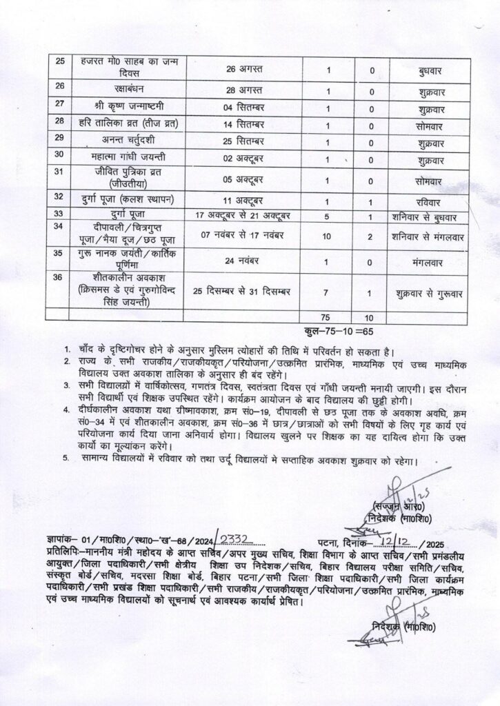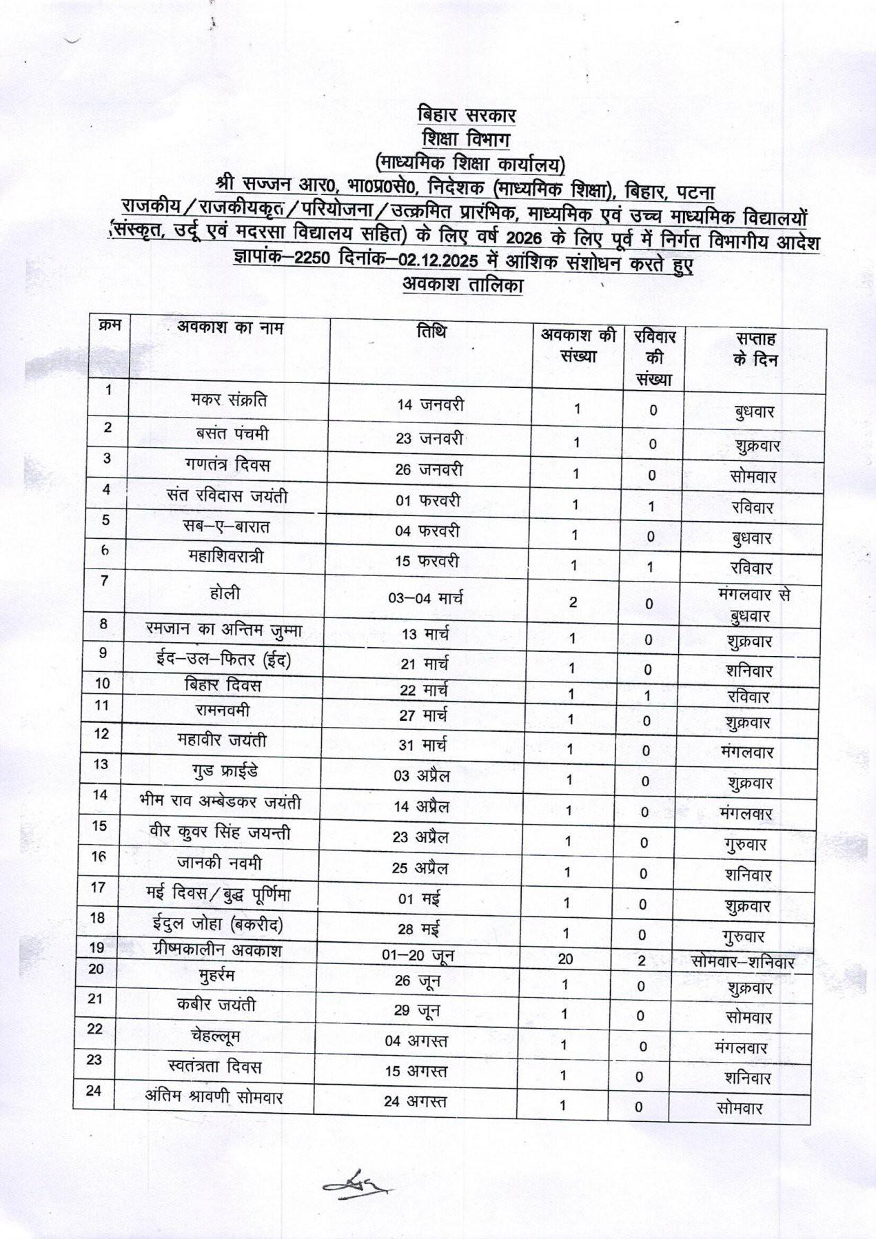 बिहार के सरकारी विद्यालयों के लिए संशोधित अवकाश तालिका जारी