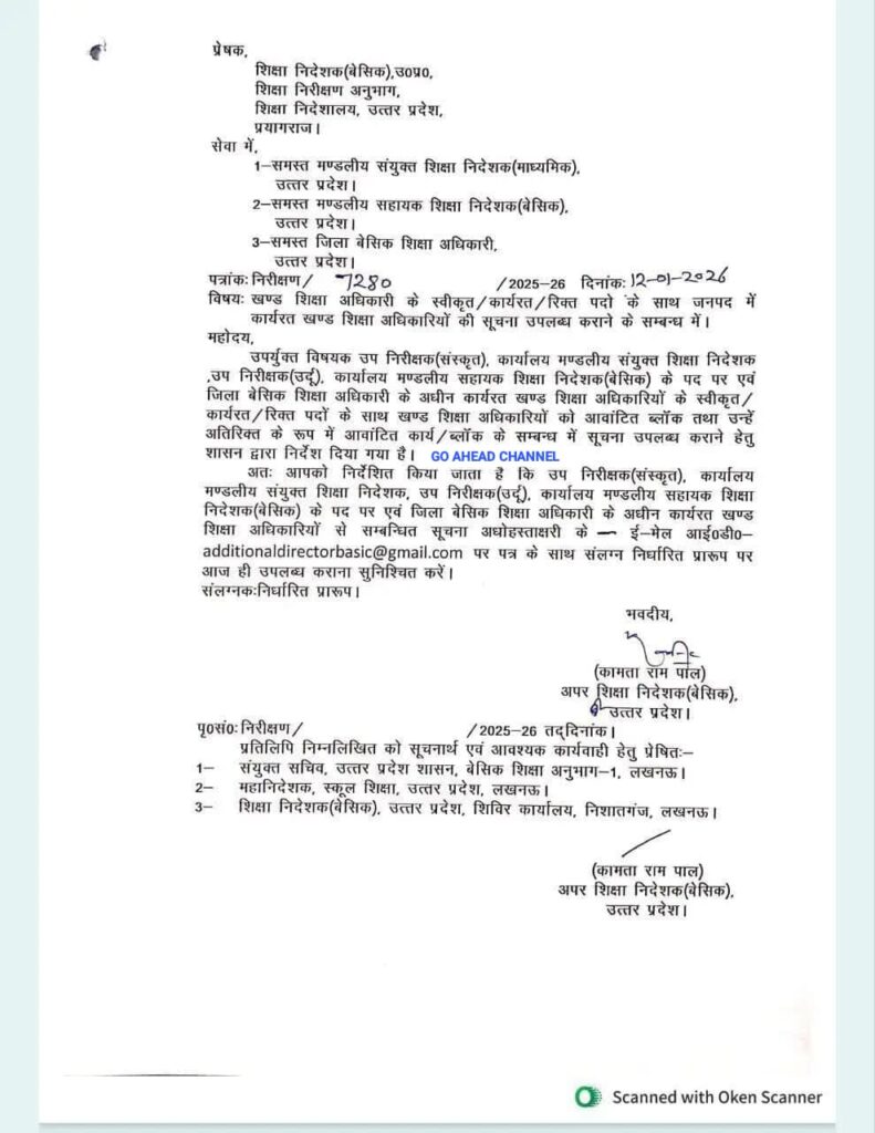 जारी आदेश के अनुसार यह सूचना उप शिक्षा निदेशक (संस्कृत), मंडलीय संयुक्त शिक्षा निदेशक, मंडलीय सहायक शिक्षा निदेशक (बेसिक) तथा जिला बेसिक शिक्षा अधिकारी के अधीन कार्यरत खंड शिक्षा अधिकारियों के संबंध में मांगी गई है। शासन का उद्देश्य बीईओ पदों की वास्तविक स्थिति का स्पष्ट आंकलन कर आवश्यक प्रशासनिक कार्रवाई सुनिश्चित करना है।