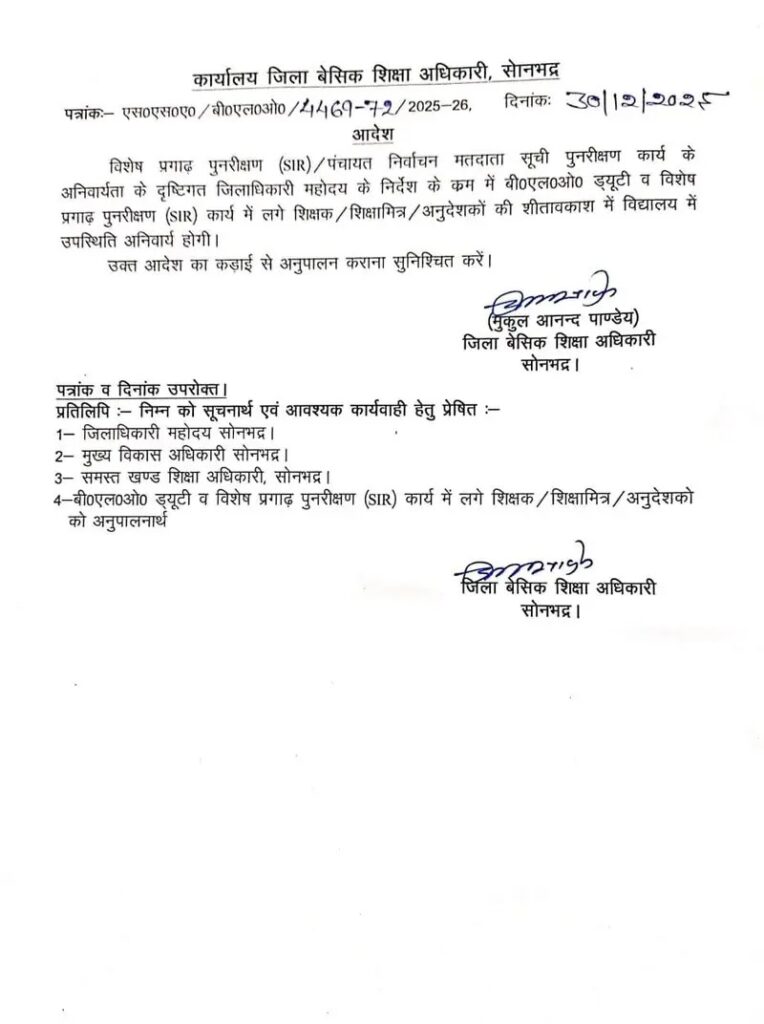 जिला बेसिक शिक्षा अधिकारी, सोनभद्र द्वारा विशेष गहन पुनरीक्षण (SIR) एवं पंचायत निर्वाचन मतदाता सूची पुनरीक्षण कार्य में लगे शिक्षकों, शिक्षामित्रों एवं अनुदेशकों को लेकर महत्वपूर्ण आदेश जारी किया गया है। आदेश के अनुसार शीतकालीन अवकाश के दौरान भी संबंधित कार्मिकों की विद्यालय में उपस्थिति अनिवार्य रहेगी।