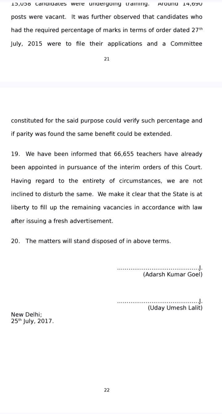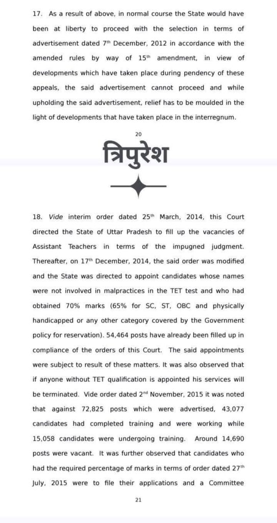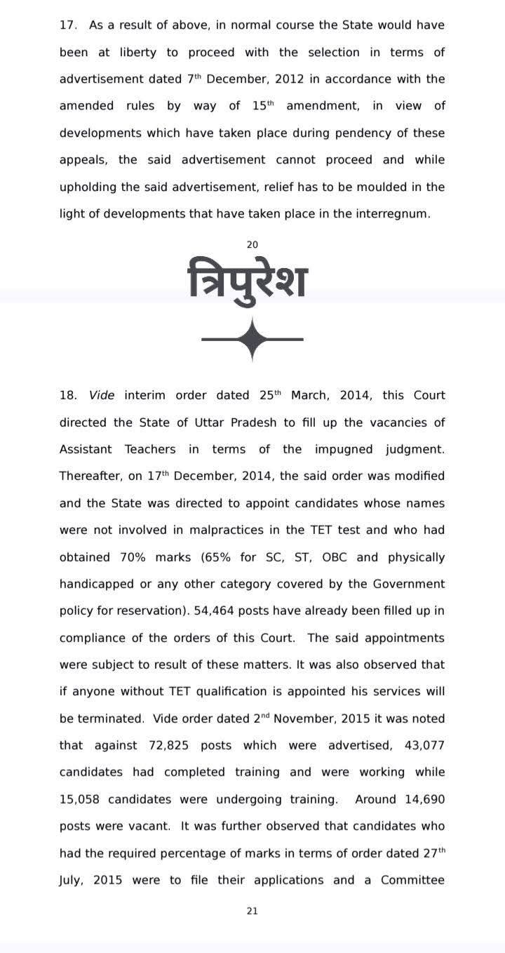 प्रणाम सभी 72825के अचयनित भाइयों व बहनों,, जैसा कि बहूचर्चित इस भर्ती प्रकरण के विषय मे माननीय जस्टिस संजय करोल व जस्टिस वी वराले प्रसन्ना जी के बेंच ने दिए गये पूर्व के अंतिम 25जुलाई 2017 के जजमेंट मे उल्लेखित पैरा 17के उस मुख्य बिंदु को पकड़ लिए हैँ जो सरकार कि गले कि फांस आज से 8से पहले ज़ब फ़ाइनल जजमेंट मे भी था और अब वर्तमान मे है 😂 कहने का मतलब आगे कुआँ पीछे खाई नियोक्ता या अथारिटी को। वो मुख्य विन्दु है पैरा 17 का :-relief has to be moulded in thelight of developments that have taken place in the interregnum. यही वह फ़ाइनल जजमेंट का लाइन है जिसको माननीय जस्टिस न्याय के देवता स्वयं साक्षात श्री कृष्णा रूपी संजय करोल धर्म रूपी ध्वजा पताका फहराने को आतुर हैँ और क्यों न आतुर हों जो आप लोग अधिक अंक पाने के बावजूद लगभग 14वर्षों से दर -दर कि ठोकरें खा रहे थे। न्याय भी आपके संघर्ष को देखकर पसीज गया🙏 ज़ब ज़ब धर्म कि हानि होती है तबतब अधर्म का विनाश करने के लिए स्वयं नारायण किसी न किसी रूप माध्यम से वो एहसास कराते हैँ कि घबराओ नहीं मैं आ गया हुँ?? न्यायके सर्वोच्च एवं सर्वोपरि मंदिर मे अब न्याय होगा इसके अतिरिक्त और कुछ भी नहीं। 5000वर्ष पहले कुरुक्षेत्र के मैदान मे ज़ब अर्जुन अपनों से बड़े के सामने हथियार डाल दिए थें तब उसी निर्णायक मैदान मे भगवान वासुदेव अर्जुन को अपना विहंगम रूप दिखाकर उनकी जिजीविषा को शांत किये थे। आज एक बार फिर जस्टिस संजय करोल ने उसी आदेश कि लाइन को गाँठ मार लिए हैँ जो सरकार के नब्ज कि पसली थी। तमाम आरगुमेंट और विश्लेषण के आधार पर ही जज साहब ने कहा है कि संख्या 50 हो, 1000 हो या 15000 हो या सो मेनी, इससे मुझे फर्क नहीं पड़ता। मैं ग्राउंड लेवल पे जाकर देखूंगा क्या कुछ हो सकता है पहले मुझे तीनो नोडल अधिवक्ता से क्रॉस चेक करवाना है कि 16दिसम्बर रात्रि बारह बजे तक कितने लोग दोनों शर्तो को पूरा करते हुये मुझसे न्याय कि गुहार लगा रहे हैँ विगत 8वर्षों से –अब मैं उनके अश्रु की धारा को जरूर पोछूँगा 😰😰 क्यूंकि समय परिवर्तनशील है। सरकारी वकील श्रीमती ऐश्वर्या भाटी मैम भी चुपचाप न्याय के देवता के हर इंस्ट्रक्शन को आत्मसात कर रही थीं। जस्टिस संजय सर ने पैरा 17 के अलावा पैरा 18के उस पॉइंट को भी माइंड मे रखें हैँ जो सरकार के लिए नासूर चुभने जैसा है, पैरा 18 मे जज साहब ने कहा कि ज़ब 66655लोगों को अंतरिम आदेशों से प्रोटेक्ट करतेहैँ सम्मलित रूप से 1100 मे से 839, तो जस्टिस दीपक मिश्रा व जस्टिस यू यू ललित जी के भी आदेशों का कम्प्लेआयेंस होना चाहिए था क्यूंकि कंसीडर का आदेश 07दिसम्बर 15के बाद, 24 फरवरी 16, 26अप्रैल 16, 28अगस्त 16, लास्ट 25जुलाई 2017 अंतिम जजमेंट तक आदेश का पालन नहीं किया गया इस मुद्दे को भी जस्टिस संजय जी गाँठ मार लिए हैँ क्यूंकि 839मे से 239रिस्पेडेंट (जो बेचारे हाइघ्कोर्ट से होते हुय