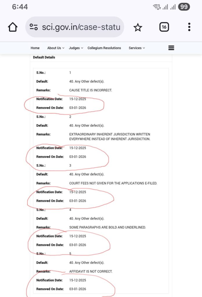 *मित्रों,अपने टेट अनिवार्यता प्रकरण में आज एक सुखद खबर है।यूपी सरकार द्वारा माननीय सर्वोच्च न्यायालय में योजित पुनर्विचार याचिका केस डायरी संख्या -53434/2025 में माननीय सर्वोच्च न्यायालय द्वारा जो 5 डिफेक्ट्स गत 15 दिसंबर को लगाये गये थे,उसे आज 3 जनवरी को यूपी सरकार के लायर द्वारा दूर/रिमूव करा दिया गया है।अब पुनर्विचार याचिका डिफेक्टिव लिस्ट से बाहर आ गयी है।अब याचिका पेंडिंग शो होने लगी है।