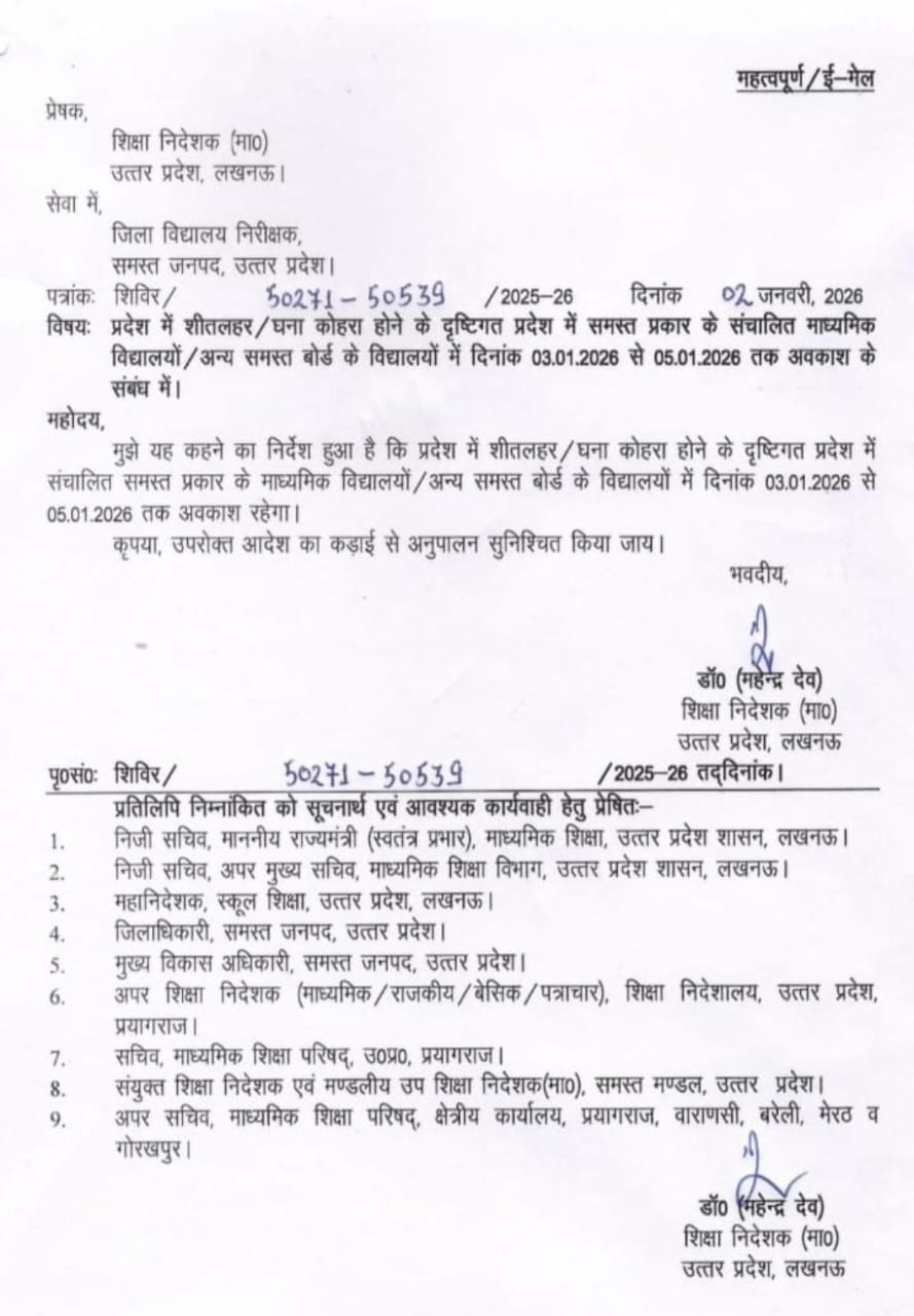 मुझे यह कहने का निर्देश हुआ है कि प्रदेश में शीतलहर/घना कोहरा होने के दृष्टिगत प्रदेश में संचालित समस्त प्रकार के माध्यमिक विद्यालयों/अन्य समस्त बोर्ड के विद्यालयों में दिनांक 03.01.2026 से 05.01.2026 तक अवकाश रहेगा।
